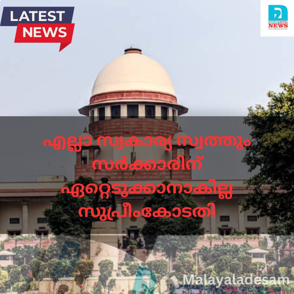 പൊതുനന്മയുടെ പേരില് എല്ലാ സ്വകാര്യ സ്വത്തും സര്ക്കാരുകള്ക്ക് ഏറ്റെടുക്കാനാകില്ലെന്ന് സുപ്രീംകോടതി ഭരണഘടനാ ബെഞ്ച്. ഭൗതിക വിഭവങ്ങളുടെ പരിധിയില് എല്ലാ സ്വകാര്യസ്വത്തും വരില്ലെന്നു ചൂണ്ടിക്കാട്ടിയാണ് ചീഫ് ജസ്റ്റിസ് അധ്യക്ഷനായ ബെഞ്ചിന്റെ വിധി ഭരണഘടനയുടെ അനുഛേദം 39 ബിയിലെ സാമൂഹിക വിഭവങ്ങള് എന്ന നിര്വചനത്തില് എല്ലാ സ്വകാര്യ വിഭവങ്ങളും ഉള്പ്പെടുമോ എന്നാണ് ഭരണഘടനാ ബെഞ്ച് പരിശോധിച്ചത്. ചില സ്വകാര്യ സ്വത്തുക്കള് ഭൗതിക വിഭവങ്ങളുടെ പരിധിയില് വരുമെങ്കിലും എല്ലാം അത്തരത്തില് നിര്വചിക്കാനാവില്ലെന്ന് ഒന്പതംഗ ബെഞ്ചിലെ എട്ടുപേരും നിലപാടെടുത്തു. സ്വകാര്യ സ്വത്ത് സര്ക്കാരിന് ഏറ്റെടുത്ത് വിതരണം ചെയ്യാമെന്ന 1978 ജസ്റ്റിസ് വി.ആര്.കൃഷ്ണയ്യരുടെ വിധി പുനര്വ്യാഖ്യാനം ചെയ്താണ് ഭരണഘടനാ ബെഞ്ചിന്റെ ഉത്തരവ്.